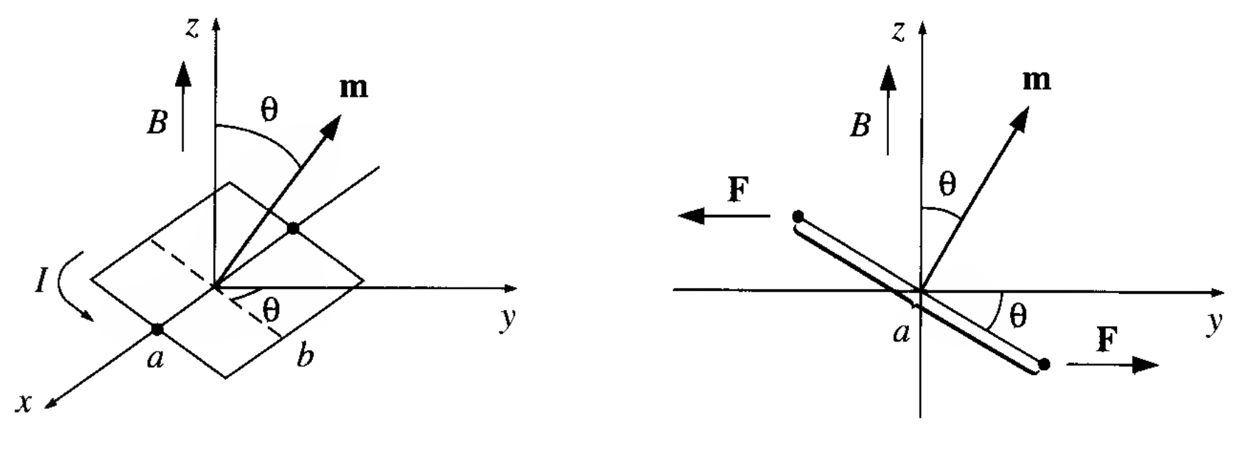 Consider a square loop of side lengths and , carrying a steady current . Center the loop at the origin, and tilt it an angle from the axis towards the axis. Let point in the direction. The forces on the two sloping sides cancel (they tend to stretch the loop, but they don’t rotate it). The forces on the “horizontal” sides are likewise equal and opposite (so the net force on the loop is zero), but they do generate a torque:
